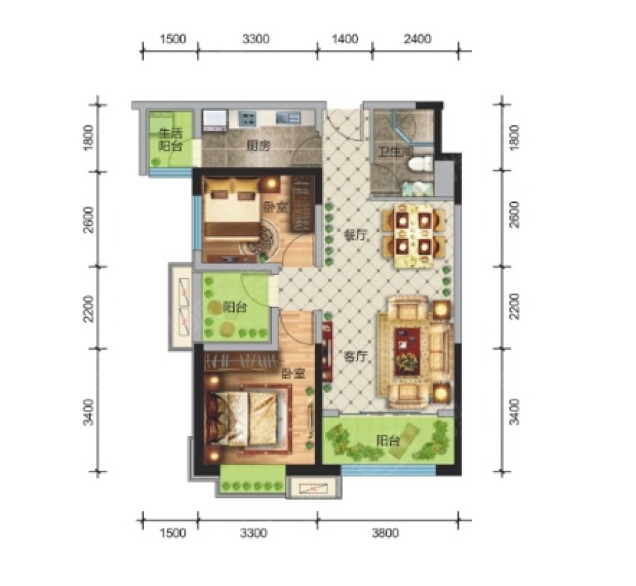 卧室:温馨两室,可改三房。。 厨房:厨房带生活阳台,延伸空间使用。。 客厅:餐客一体,享受生活。。