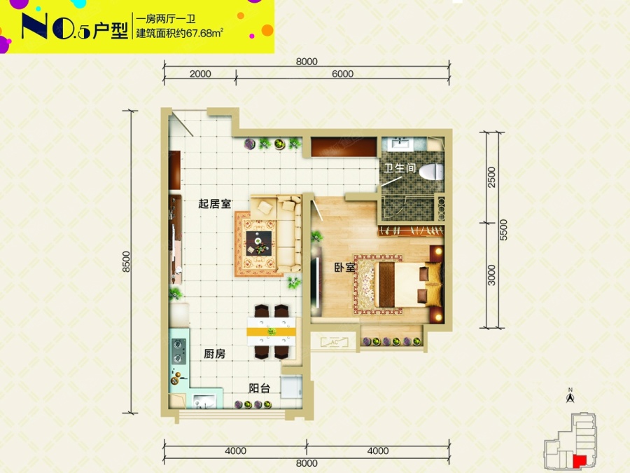 卫生间:卫生间内干湿分离,将洗浴间和洗漱台区分开来,主人不用担心地面的干燥和清洁问题。。 厨房:开放式厨房,符合现在年轻人生活方式,同时与餐桌相连,提供生活了的便捷性。。 客厅:入户可见4*8.5m的宽阔空间,带有南向阳台,保证了室内的采光和通风,主人也可自由设计空间。。