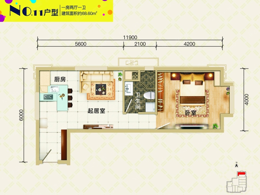 卧室:4*4.2m的宽阔卧室带有飘窗,充分保证了室内的采光和通风,并且宽阔的卧室可自由设计摆放家具。 卫生间:卫生间内干湿分离,并且带有窗户,有较好的通风环境可保证卫生间内的干燥和清洁。 客厅:入户可见4*5.6m的宽阔客厅,厨房与餐厅连成一体,虽然是公寓户型却为生活提供了便利。