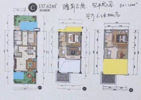 建面:137平,四联排,地面三层卖点:户户临河观山