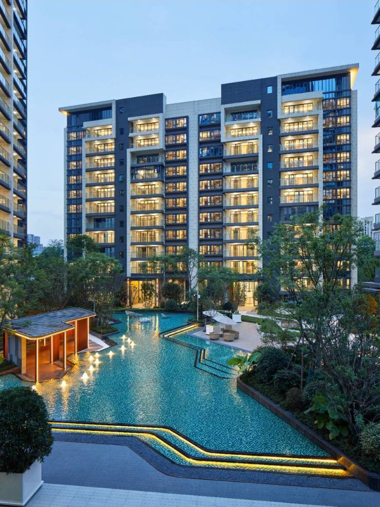 项目以新加坡式的滨海城市现代风格为根基,流线型极简艺术线条呈现水韵律动之美。大面积玻璃幕墙映射园内水景,光影流转,虚实有致,LOW-E玻璃的配置,简约不失实用性。