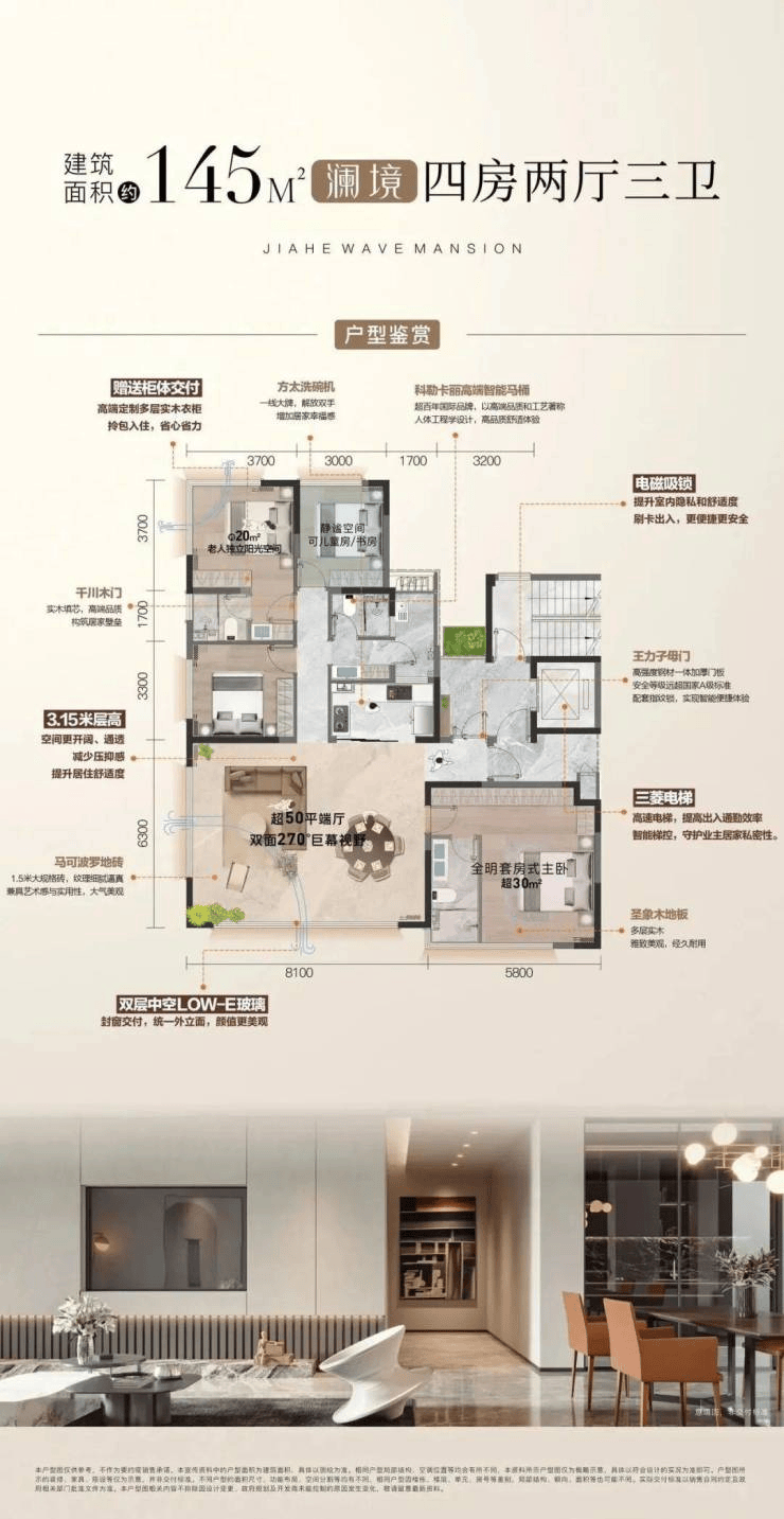 约50㎡大横厅,双面采光 270°巨幕视野,将至美景观引入室内,诗意画境日夜皆景