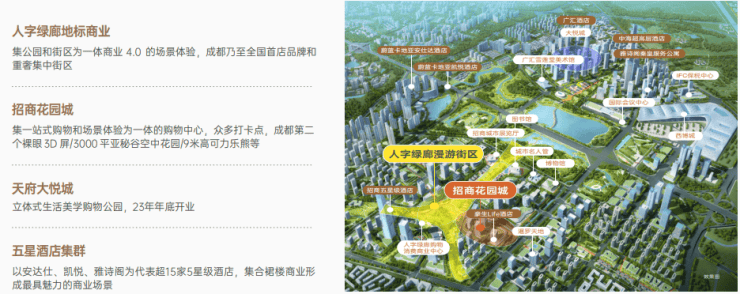 天府新区唯一可形成商圈的板块,集人字绿廊,低密情景独栋商业,招商花园城,购物中心,中粮大悦城购物中心,以及众多五星级酒店集群。这里形成了每年超过500亿+的城市级商业中心,可媲美上海陆家嘴/春熙路商圈。