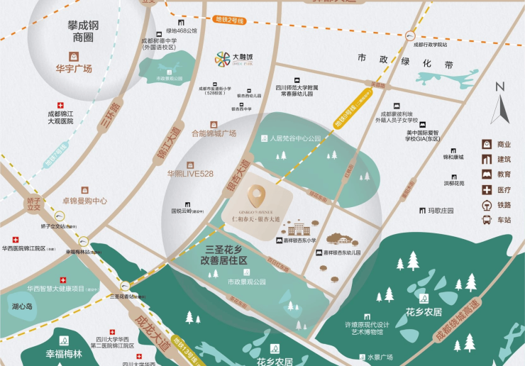 坐拥成都东南黄金区位:横向贯通金融城与行政学院;纵向依托驿都大道,串联攀成钢-东大路商圈,衔接绿地468与行政学院TOD,形成多维交通网络。