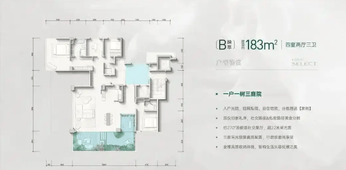 04 主力产品解析 精粹145-183㎡四代住宅,以空中庭院为核心,通过场景化设计满足塔尖家庭对功能、安全与诗意的全维追求