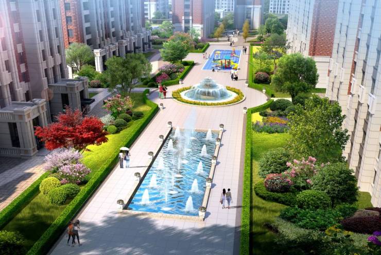 多组团景观模式,著造层次感水系游园景观,江岸两侧搭配林木、花簇等臻稀植被