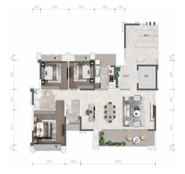 此面积段户型主打功能性、高性价比与横厅体验。约128㎡户型拥有约6米大横厅;约148㎡户型则将横厅面宽拓展至约8米,并采用“三厅”设计,空间感更为从容。三房两卫的配置,搭配宽境观景阳台,是追求品质三房、重视公共活动空间的精英家庭优选。
