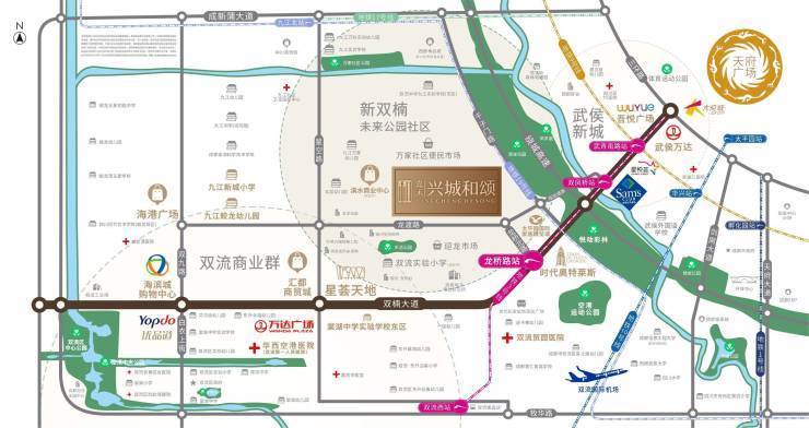 承接武侯新城、金融城等高端改善外溢,加上项目位于区域发展主轴线双楠大道,产业及配套延此轴线分布,人流集中,需求旺盛,且有已成型的25000亩环城生态公园和8500亩的空港中央公园及设计规划的新双楠未来公园社区。
