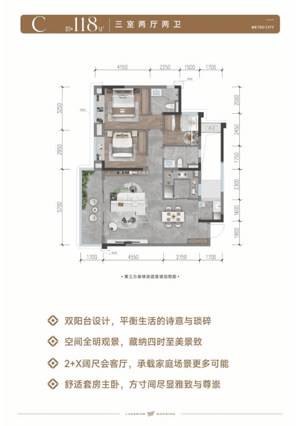 此系列户型分布于22-24层的高层楼栋,采用2梯4户的实用设计。在约107-118㎡的紧凑面积内,实现了三房两厅的功能布局,空间利用率高。户型注重采光与实用性,是年轻家庭、首改客户入驻科创新城核心区,享受TOD便利与湖景资源的优选门槛产品。