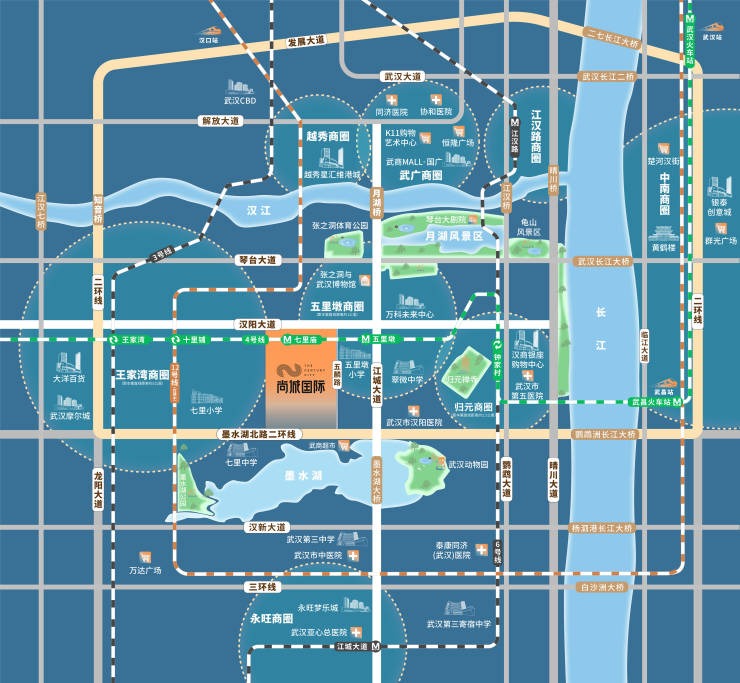 约15分钟:15分钟车程即达永旺、越秀、国广商圈;约25分钟:黄金生活半径覆盖江汉路、中南、汉街商圈。
