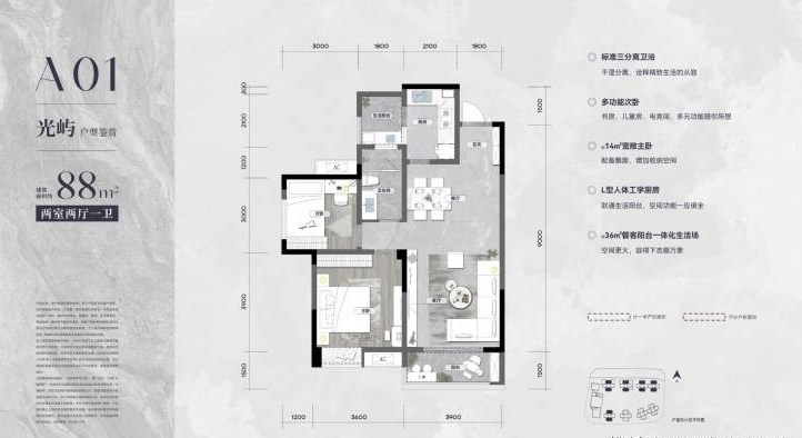 布局亮点:独立玄关+双阳台设计(景观阳台+生活阳台),主卧约14㎡,次卧开间3米,实得率超90%。