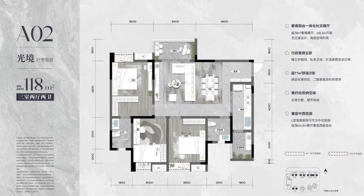 布局亮点:横厅设计,主卧带独立衣帽间(进深4.8米),次卧均设飘窗,双卫分离提升便利性。