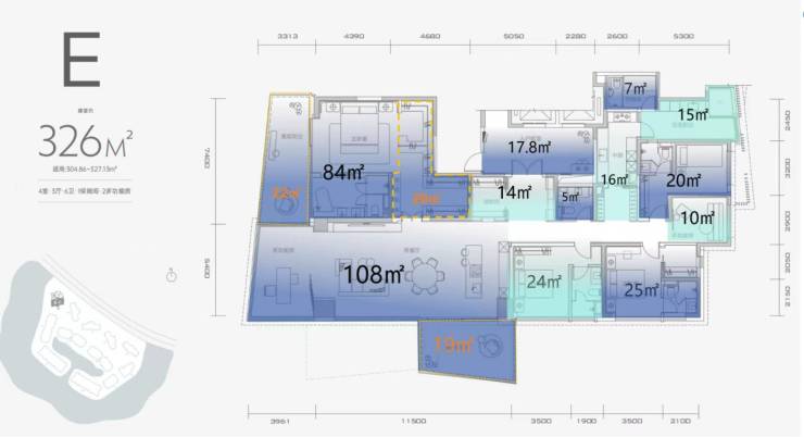 326㎡,总价1100-1200左右/(少一个阳台307㎡总价减100万)