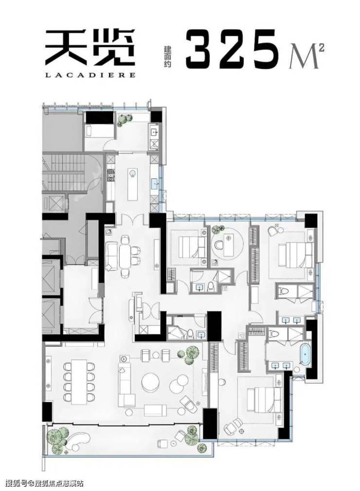 超级定位:大平层+别墅定位,平层户型起步面积325m²,高阶面积380m²,超奢一层一户650m²