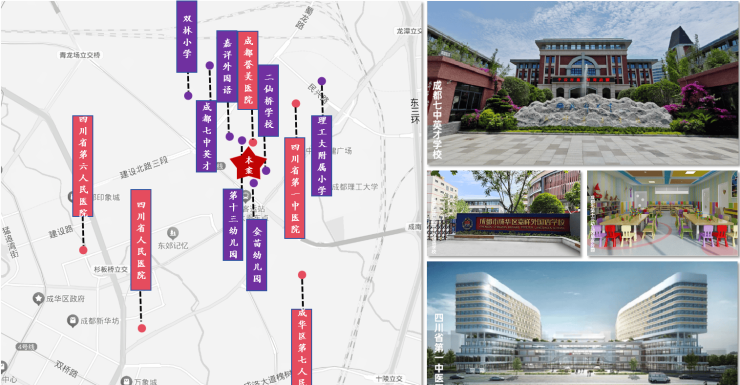 医院:1KM内有三家医院四川省第一中医医院,成都誉美医院,4KM内有四川省人民医院、四川省第六人民医院,成华区第七人民医院等为您的健康保驾护航