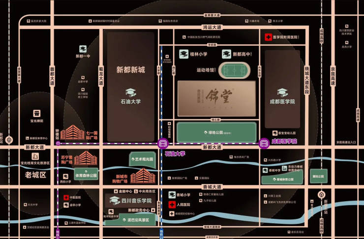 医疗资源:新都区妇幼保健院/人民医院,1.5公里直达规划中的成都医学院附属医院(总建面57.8万㎡现代化医疗中心)