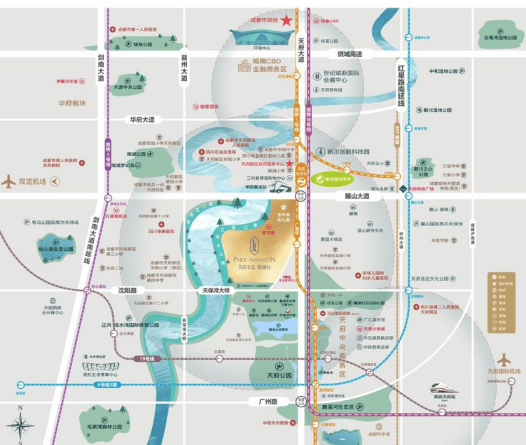 邻天府大道、梓州大道、剑南大道三大城市主干线,接驳地铁1号线和18号线;周边规划高铁天府站,预计2025年建成,全维度立体交通,兼顾事业与家庭。