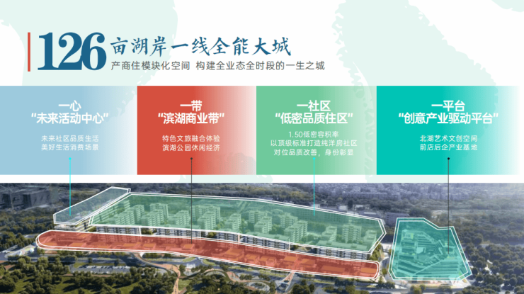 规划有“一心一带一社区一平台”,分别指“未来活动中心”、“湖滨商业带”、“创意产业驱动平台”、“低密品质住区”