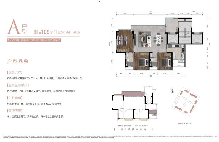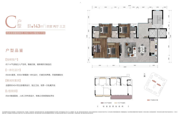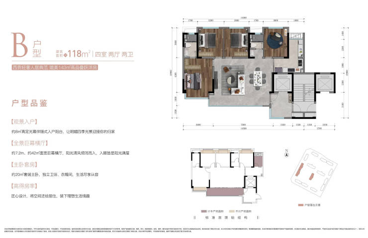 实得率在96%,套四双卫,7.2米的开间、7.45米的大阳台,书房含飘窗都有约10.8㎡,飘窗可改造,可根据需求灵活调整空间。