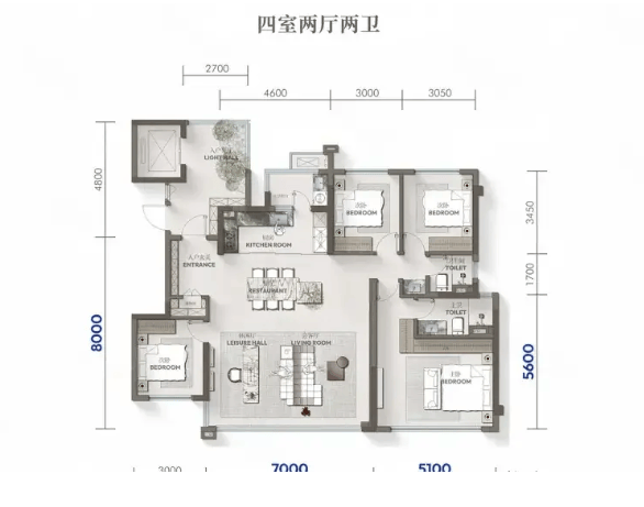 作为社区的入门级改善户型,在2梯2户的配置下确保了私密与舒适。四房两厅两卫的布局功能完备,空间利用率高,适合追求一步到位、注重功能性与居住品质的年轻菁英家庭。