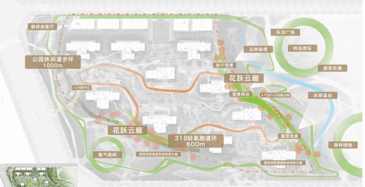 园区景观中轴,指向人字绿廊与西岭雪山,整体以“川西秘境”为出发点,对标“雪山下的公园城市”3D人文生态模板,以园区内外自然高差形成多元场景表达,打造双环两廊、川西十景的园林景致,同时将架空层泛会所与景观体系紧密相融,打造自然会客厅,让川西景致嵌入生活,让度假成为日常。