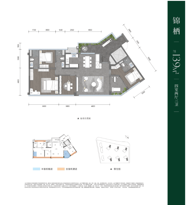 项目主力户型为建面约139㎡和176㎡的“全景墅式大平层”,均设计为套四两厅三卫,主打“全景”视野与“墅式”空间体验。