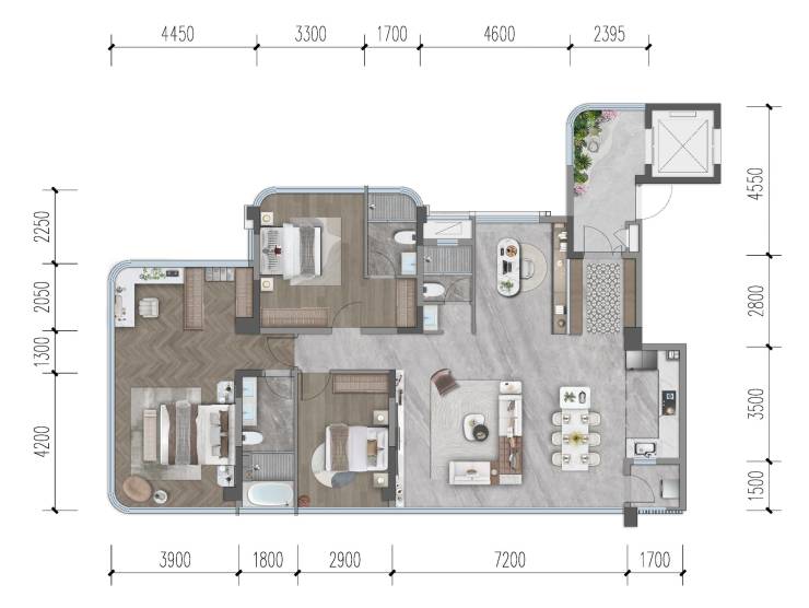 户型分析:楼尊视野 中庭楼王位置,尽享小区最佳中庭景观和超大楼间距,南北朝向,采光通风俱佳· 社交方厅约76㎡LDKB中央社交方厅,满足社交、聚会等场景,开放式中西厨+灵动导台· 越级享受开间超7米,媲美市场上250㎡豪宅尺寸感,超大会客厅尽显豪宅气派· 光厅入户约12㎡光厅入户,独立拼花玄关,双侧收纳空间,满足全家需求· 中西双厨厨房约4.5米超大开间,U型设计,中西厨联动,布局合理,尺度开阔· 星级套房星级双套房设计,洞悉家庭多元所需,约42㎡环幕主卧超大套房,行政级衣帽间尽显尊贵,独立式浴缸礼致峯范人生· 超大空间实际可利用空间约建筑面积的103%