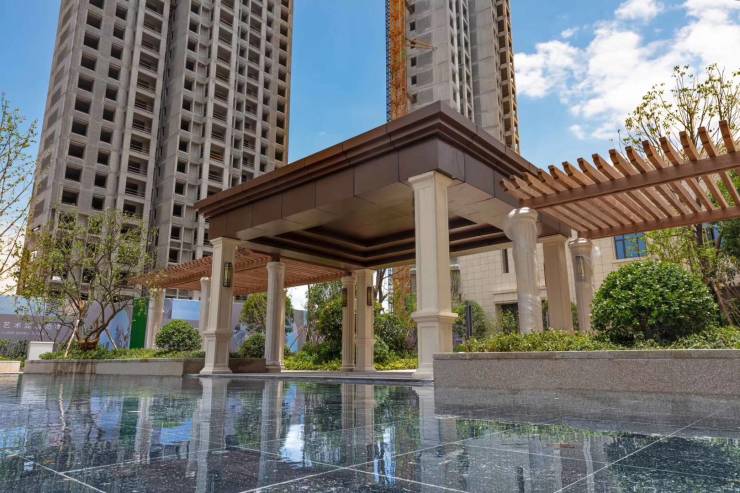 通过酒店式大堂进入小区,映入眼帘的是约6300余平的园林示范区,其展示规模在经开项目罕见。汤湖观筑的园林绝对是其与众不同的亮点,项目整体容积率约2.3,放弃了传统的“排排坐”铺排,而是选择围合式布局,最小楼间距60米最大达到了110米,为业主提供更为舒适的居住环境。并且所有楼栋均为一个单元两梯三户,留出更多地面空间在社区中央造一座“公园”。园林展示实景: