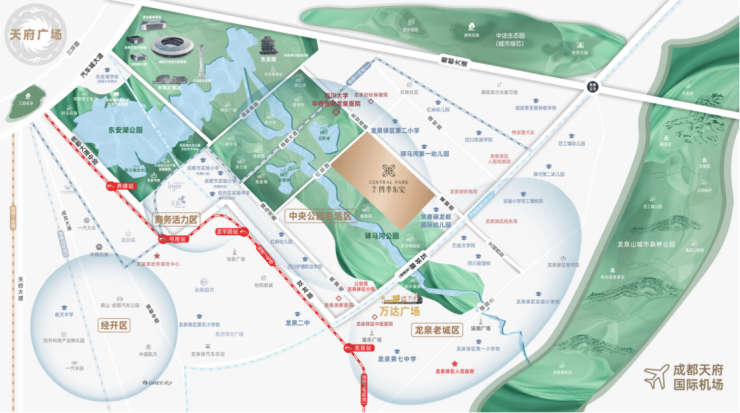占据东安新城核心区位,坐享城市发展红利。作为成都"东进"战略的重要支点,龙泉驿区正迎来全新发展机遇。项目毗邻东安湖中央公园生活区,地处东安湖2.0时代发展前沿,将打造成为区域高端人居典范。