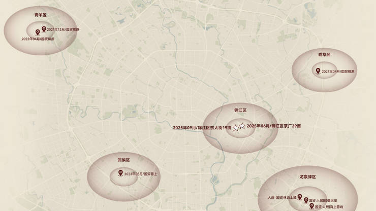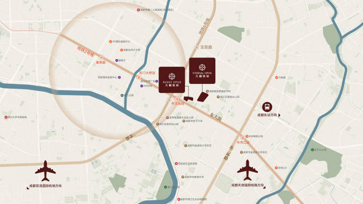 位于主城一环核心,享城市优质配套,三公里内春熙路-太古里、万象城、攀成钢三大商圈环伺,国际奢尚与精致烟火;双地铁2&6号线为引擎,踞城市黄金动脉;坐拥锦江文脉,立身潮流文化前沿。