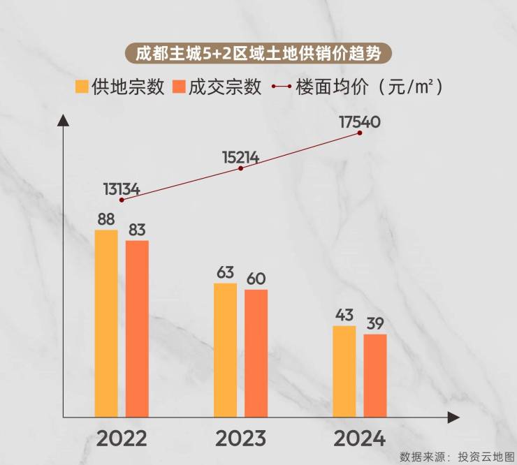 2024年成都核心区域土地成交39宗,同比下降35%;平均楼面价达17540元/㎡,同比上涨17%。土地供应收紧与地价上涨的双重因素,预示着未来新房价格将保持上行趋势。