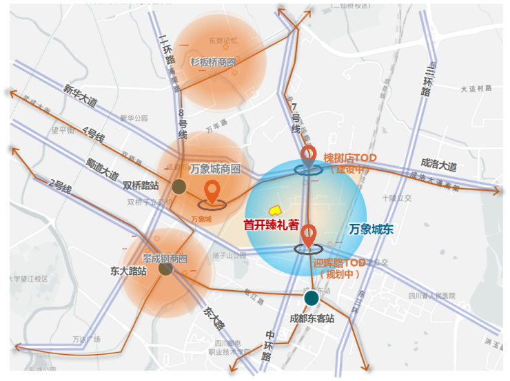 城市主干道:成洛大道/蜀都大道等4条;轨道交通:2/4/7/8号线4条地铁线;地铁站点:槐树店站等3个站点