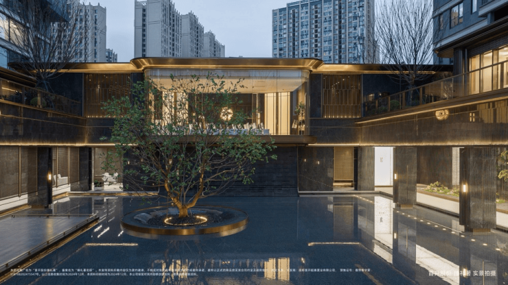下沉式庭院会所:以枯山水造景手法,打造流水庭院景观,乌桕树与瀑布帘相得益彰,营造"城市山林"的隐逸意境。