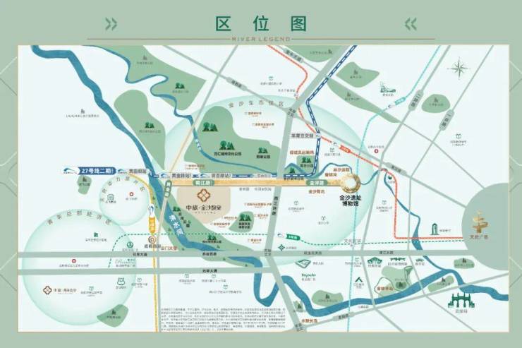 【金沙正轴 谨此一线无界河居】金泽路——蜀江路为轴的金沙正脉,自金沙遗址始,串联燕沙庭院、雍锦园、金悦湾、凤起朝鸣等传世奢宅环伺两侧。