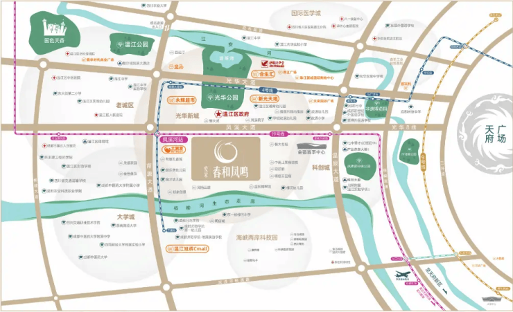爱家春和凤鸣的珍贵,首先在于它牢牢占据着光华新城的核心地段。这里不仅是温江城市发展的精华所在,更是成熟生活圈的代名词。