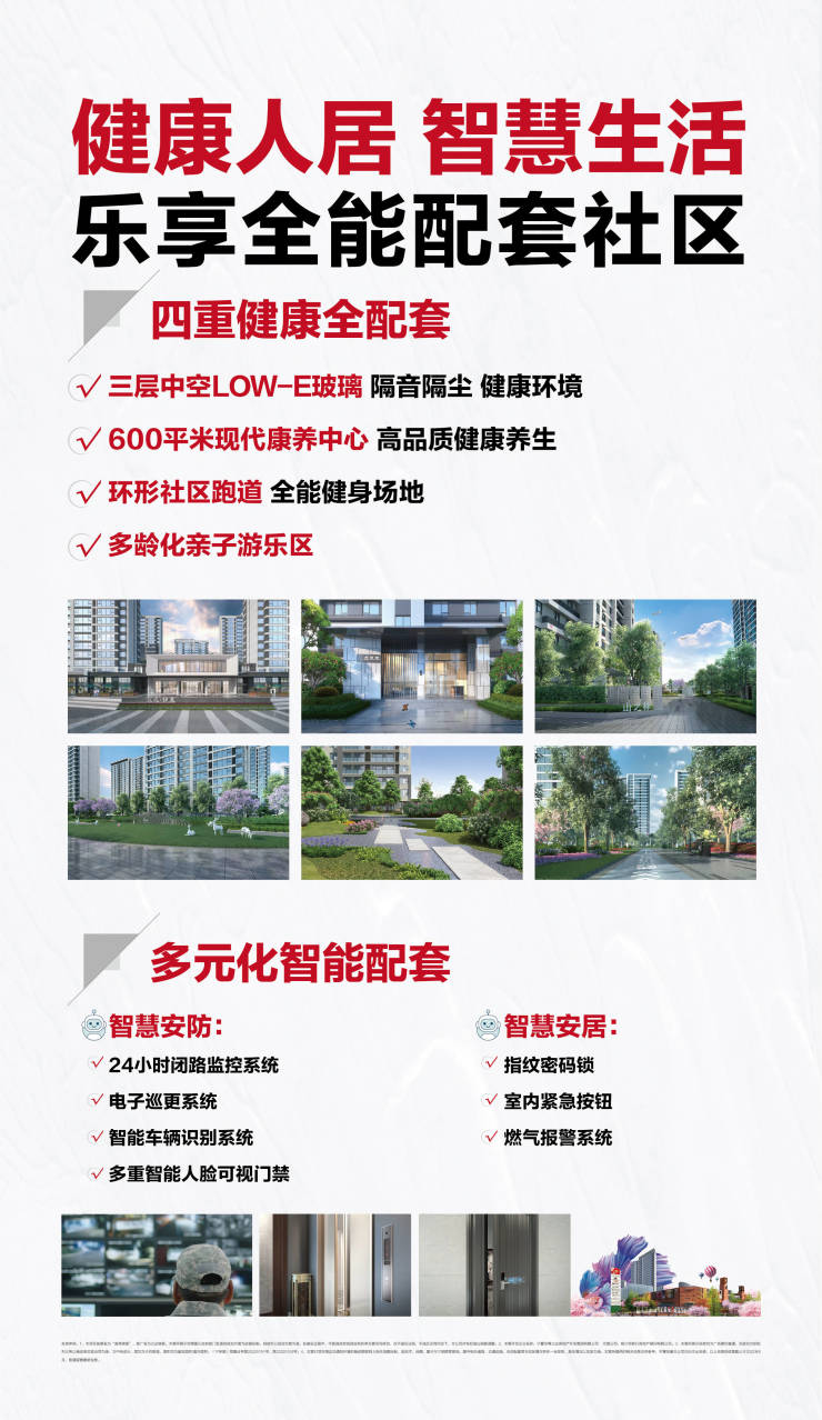 【智慧安防】社区配置视频监控系统、彩色可视楼宇对讲系统、出入口门禁管理系统、停车场管理系统及电子巡更;单元入口门禁带密码,人脸智能识别开锁。