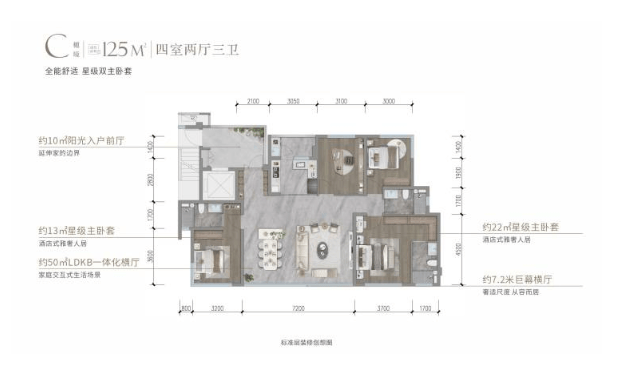 在125-139㎡的尺度内,四房两厅的格局更为从容宽松,各功能分区明确,主卧多可规划为套房。