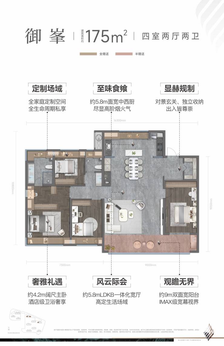 目前在售:3,5,8栋175㎡御峯约93%得房率,9米阳台50㎡方厅,阳光宽阔通透,引领武汉改善
