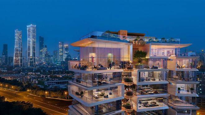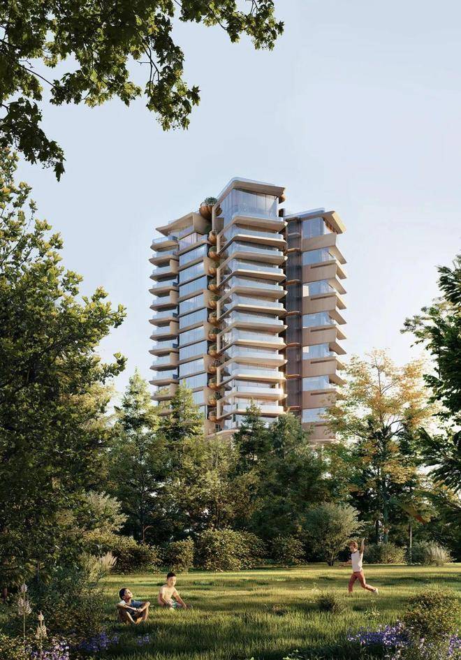 外立面摒弃传统玻璃幕墙,采用暖色仿石铝板与铜色栏杆,而最新调规后增加的玻璃比例进一步强化了“全景舱”视野。