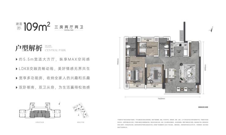 约5.5m阔尺方厅/LDKB一体化/双卧朝南/双卫从容