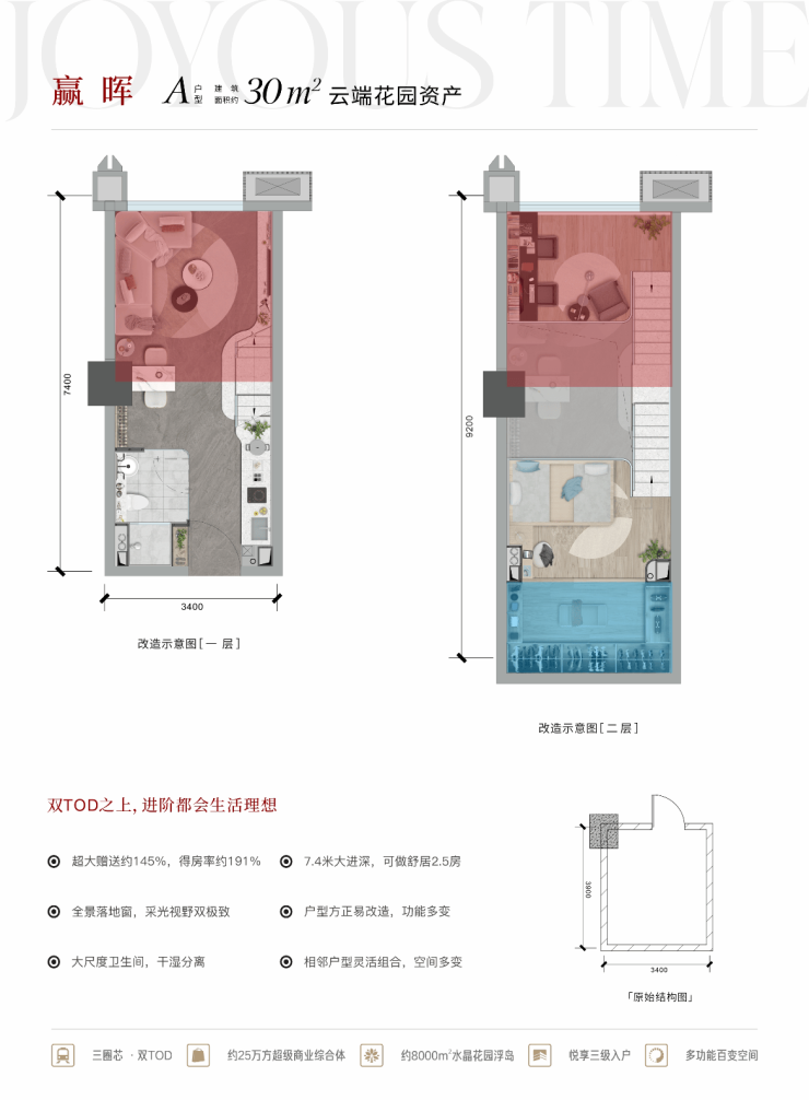 3、品质生活:8000㎡空中花园、三重归家动线、超高实用率设计(30㎡可做舒适两房)