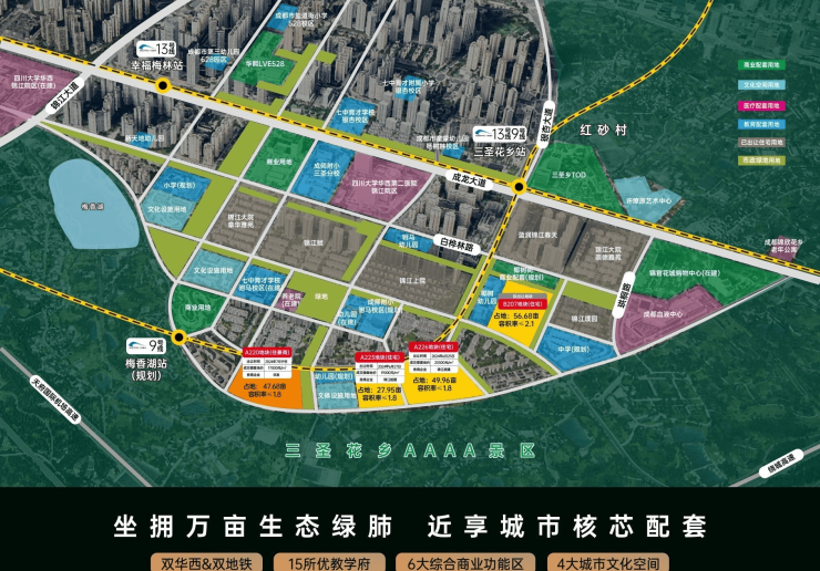 六条城市主干道构成"三横三纵"路网,快速连接金融城、东大街等核心商圈;三大TOD枢纽(三圣乡/林家坝/川师)环伺,汇聚2/7/9/13/20号线五条地铁;双机场通达优势:20公里直达双流机场,50公里接驳天府国际机场。