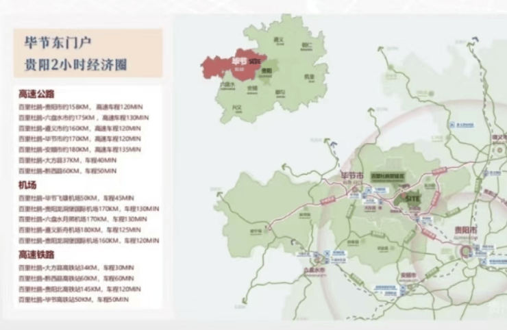 交通便利: 航空直达 毕节【飞雄机场】 贵阳【龙洞堡机场】 遵义【茅台机场】 高铁便利 川渝-2小时生活圈大方高铁站-约25分钟车程 高速通达 项目离高速口5分钟车程