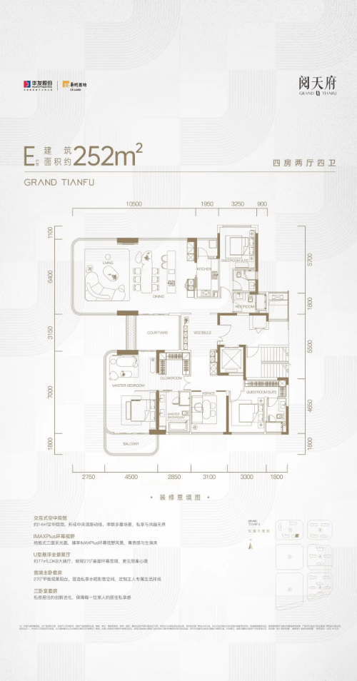 此户型为项目的巅峰革新之作,采用四室两厅四卫的殿堂级配置。它不仅拥有最大的空间尺度,更以革新性的端厅设计、270°环幕视野及三卧全套房配置,重新定义了成都平层豪宅的天花板,是追求绝对稀缺、身份象征与全球性生活方式的终极藏品。