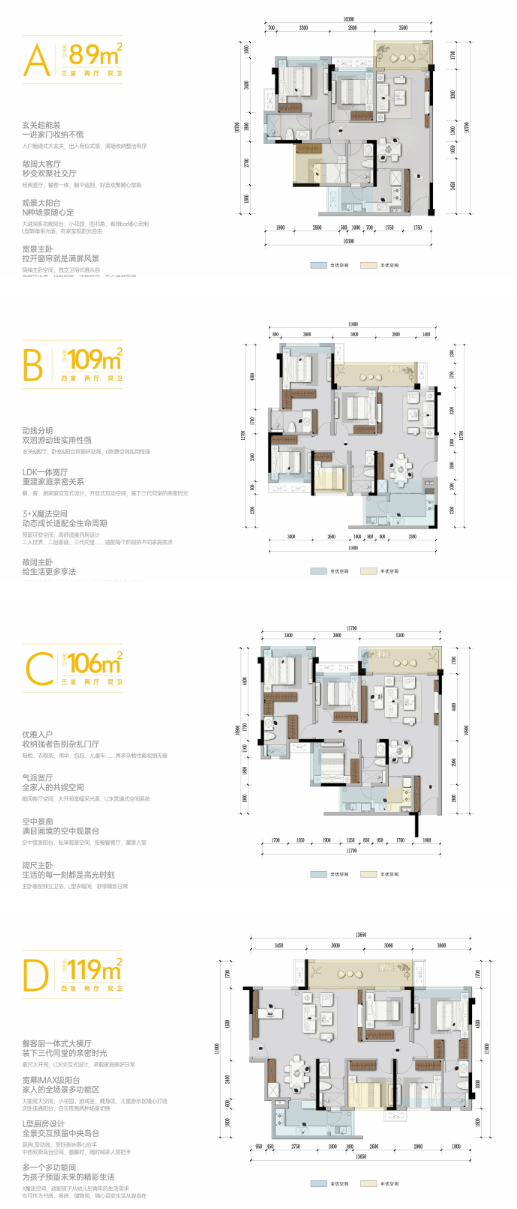 04 主力户型解析 全系89-119㎡功能型户型,以三至四房全能配置,精准覆盖从新婚首置到二孩刚改的家庭全周期