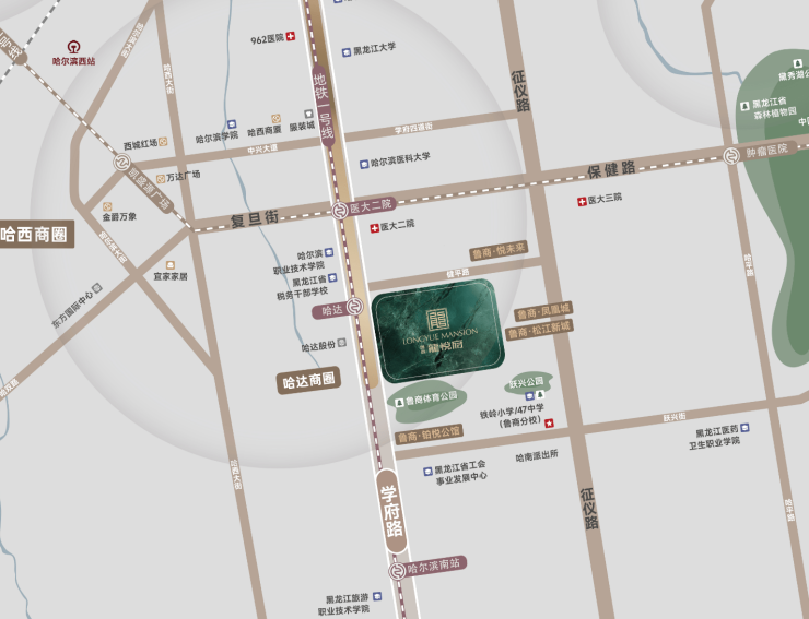 项目位于南岗区学府路之上,学府路被誉为五大百年龙脊之路,汇聚全省党政军首脑机关单位,道路两侧名校云集,坐拥顶级醇熟配套,是南岗区门户之路。龍悦府项目雄踞龙脉之上,龙脉自东大直街到学府路贯穿哈尔滨,占据这一黄金地段,显示了独特的地理优势和不可复制的价值。