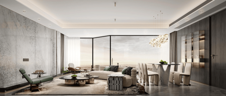 工艺细节:900×1800mm大板地砖、蜂窝铝板吊顶、定制岩板电视墙