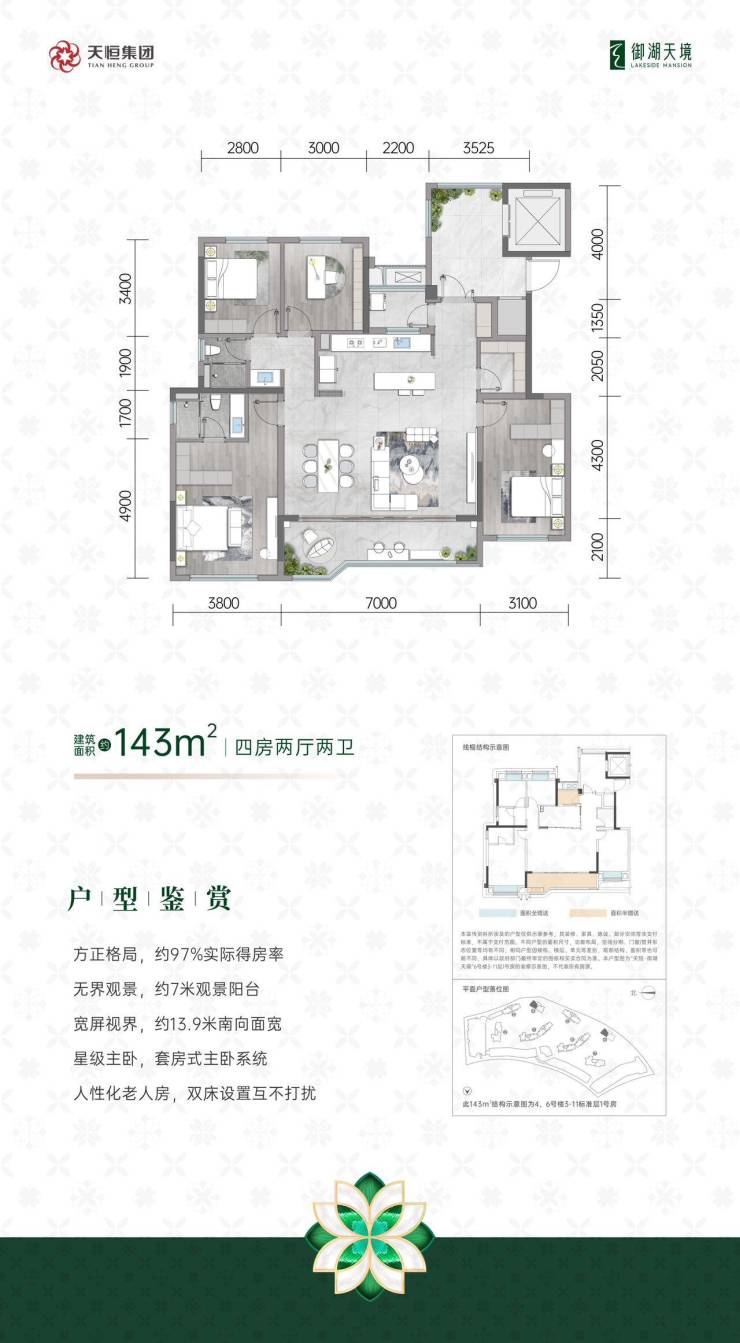 由北京天恒置业倾力打造的「天恒御湖天境」,占地61.7亩,容积率仅1.5,绿化率达30%,打造低密宜居社区。项目规划8栋住宅共220户,配备4栋商业综合体(含商业街区及星级酒店)。住宅均为11层小高层,采用2梯2户设计,公摊19%并赠送12㎡入户空间,实际得房率高达98%。