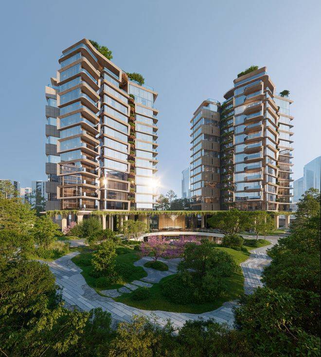 外立面摒弃传统玻璃幕墙,采用暖色仿石铝板与铜色栏杆,而最新调规后增加的玻璃比例进一步强化了“全景舱”视野。