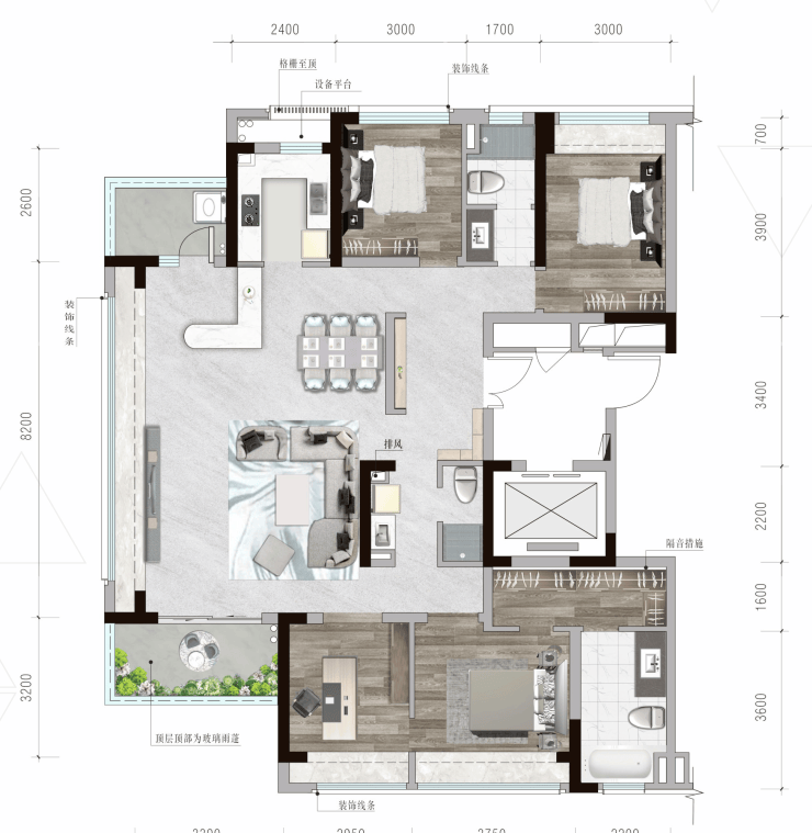 ·双阳台客厅设计,采光充足·主卧套房设计,阔绰舒居生活·中西双厨卫,营造家庭欢乐时光·入户空间,增添归家尊崇仪式